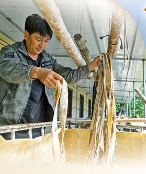 阿拉坦巴根(左二)與學(xué)員拉伸捎繩(熟皮子)。