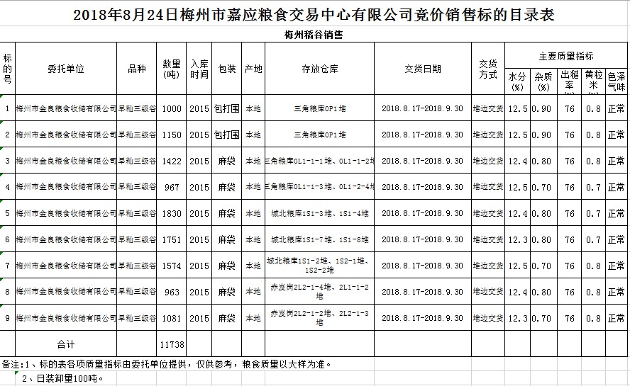 受客戶委托,梅州市嘉應(yīng)糧食交易中心有限公司定于2018年8月24日(星期五)舉辦糧食競價(jià)交易會(huì),梅州市金良糧食收儲(chǔ)有限公司擬銷售早秈稻11738噸。