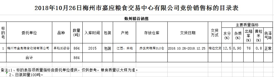 受客戶委托,梅州市嘉應(yīng)糧食交易中心有限公司定于2018年10月26日(星期五)舉辦糧食競(jìng)價(jià)交易會(huì),梅州市金良糧食收儲(chǔ)有限公司擬銷售2015年早秈稻864噸。