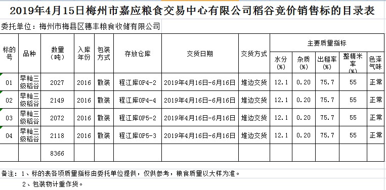 受客戶委托,梅州市嘉應(yīng)糧食交易中心有限公司定于2019年4月15日(星期一)舉辦糧食競(jìng)價(jià)交易會(huì),梅州市梅縣區(qū)穗豐糧食收儲(chǔ)有限公司擬銷售2016年早秈稻8366噸。
