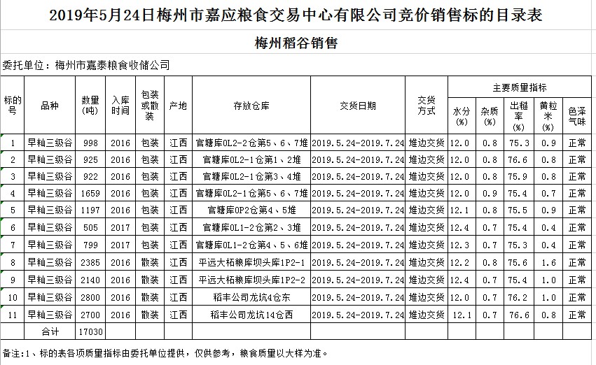 受客戶委托,梅州市嘉應(yīng)糧食交易中心有限公司定于2019年5月24日(星期五)舉辦糧食競價(jià)交易會(huì),梅州市嘉泰糧食收儲(chǔ)公司擬銷售2016年、2017年早秈稻17030噸。
