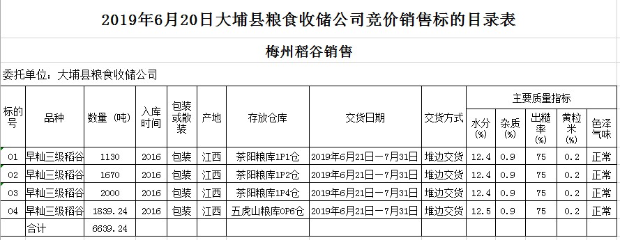 受客戶委托,梅州市嘉應(yīng)糧食交易中心有限公司定于2019年6月20日(星期四)舉辦糧食競(jìng)價(jià)交易會(huì),大埔縣糧食收儲(chǔ)公司擬銷(xiāo)售2016年早秈稻6639.24噸。