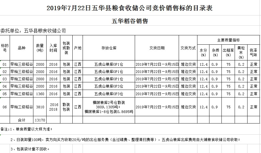受客戶委托,梅州市嘉應(yīng)糧食交易中心有限公司定于2019年7月22日(星期一)舉辦糧食競(jìng)價(jià)交易會(huì),廣東省五華縣糧食收儲(chǔ)公司擬銷售2016年早秈稻13169.1305噸,2018年早秈稻0.8695噸。