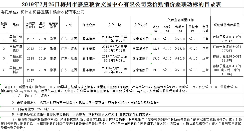 受客戶委托,梅州市嘉應(yīng)糧食交易中心有限公司定于2019年7月26日(星期五)舉辦稻谷購銷價差聯(lián)動標(biāo)的交易會,梅州市梅縣區(qū)穗豐糧食收儲有限公司擬銷售和采購早秈稻8727噸。
