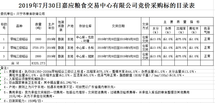 受客戶委托,梅州市嘉應(yīng)糧食交易中心有限公司定于2019年7月30日(星期二)舉辦糧食競(jìng)價(jià)交易會(huì),興寧市糧食收儲(chǔ)公司擬采購(gòu)2019年早秈稻8320.273噸。