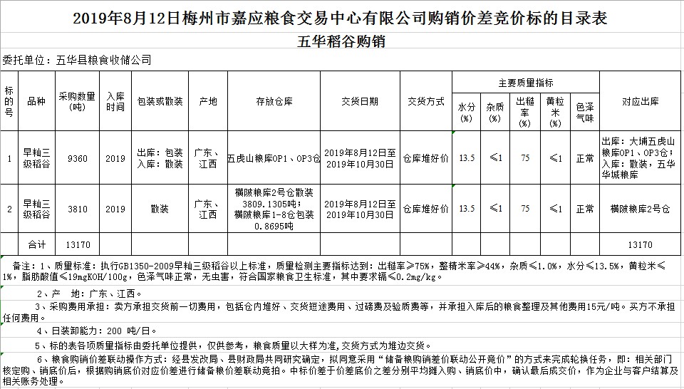 受客戶(hù)委托,梅州市嘉應(yīng)糧食交易中心有限公司定于2019年8月12日(星期一)舉辦稻谷購(gòu)銷(xiāo)價(jià)差聯(lián)動(dòng)標(biāo)的交易會(huì),廣東省五華縣糧食收儲(chǔ)公司擬銷(xiāo)售和采購(gòu)早秈稻13170噸。