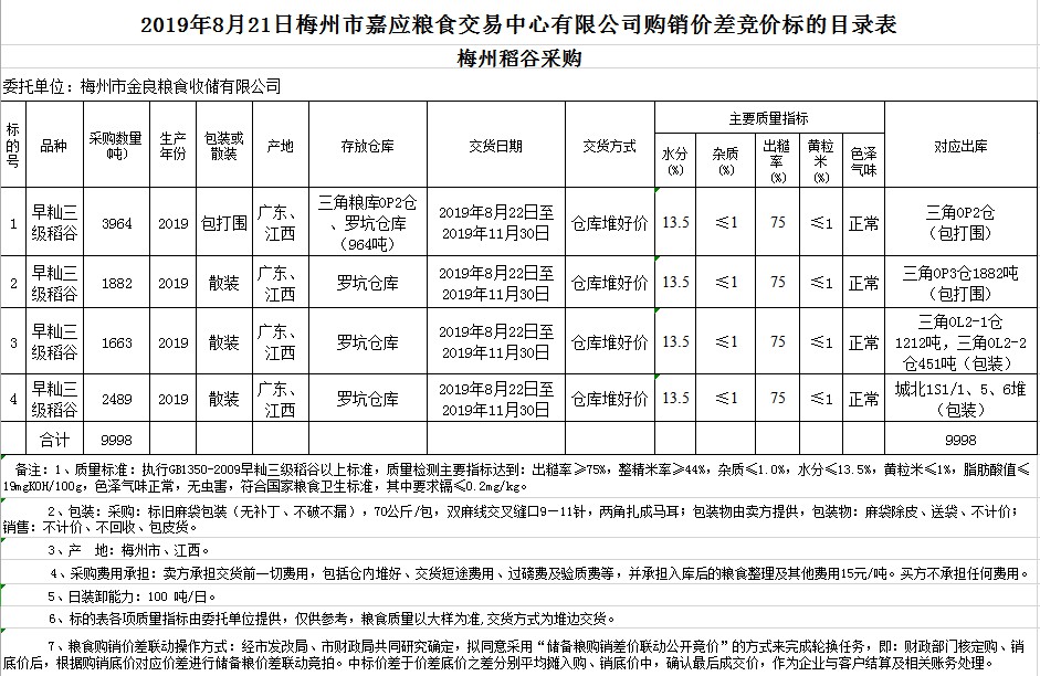 受客戶委托,梅州市嘉應(yīng)糧食交易中心有限公司定于2019年8月21日(星期三)舉辦稻谷購銷價(jià)差聯(lián)動(dòng)標(biāo)的交易會(huì),梅州市金良糧食收儲(chǔ)有限公司擬銷售和采購早秈稻9998噸。