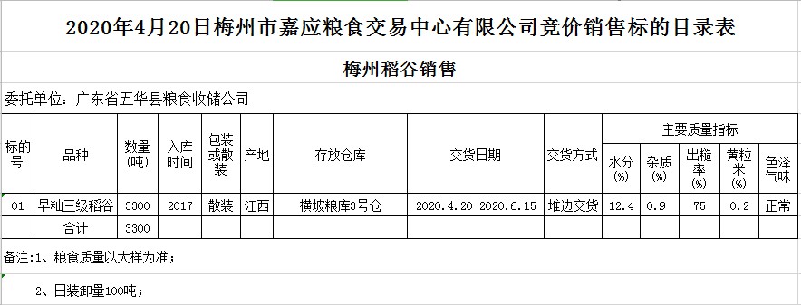 受客戶(hù)委托,梅州市嘉應(yīng)糧食交易中心有限公司定于2020年4月20日(星期一)舉辦糧食競(jìng)價(jià)交易會(huì),廣東省五華縣糧食收儲(chǔ)公司擬銷(xiāo)售2017年早秈稻3300噸。