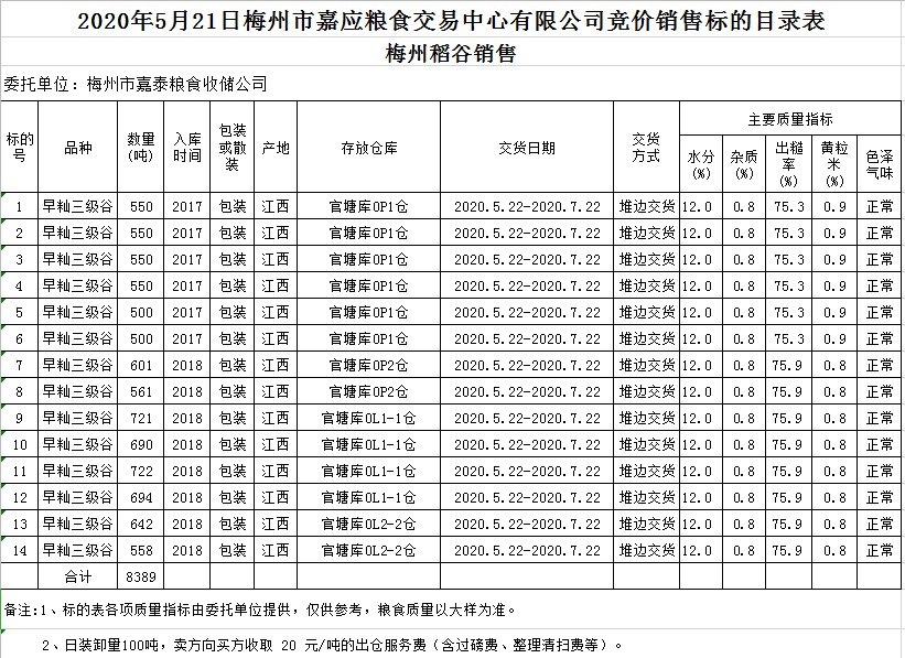 受客戶委托,梅州市嘉應(yīng)糧食交易中心有限公司定于2020年5月21日(星期四)舉辦糧食競價交易會,梅州市嘉泰糧食收儲公司擬銷售2017年、2018年早秈稻8389噸。
