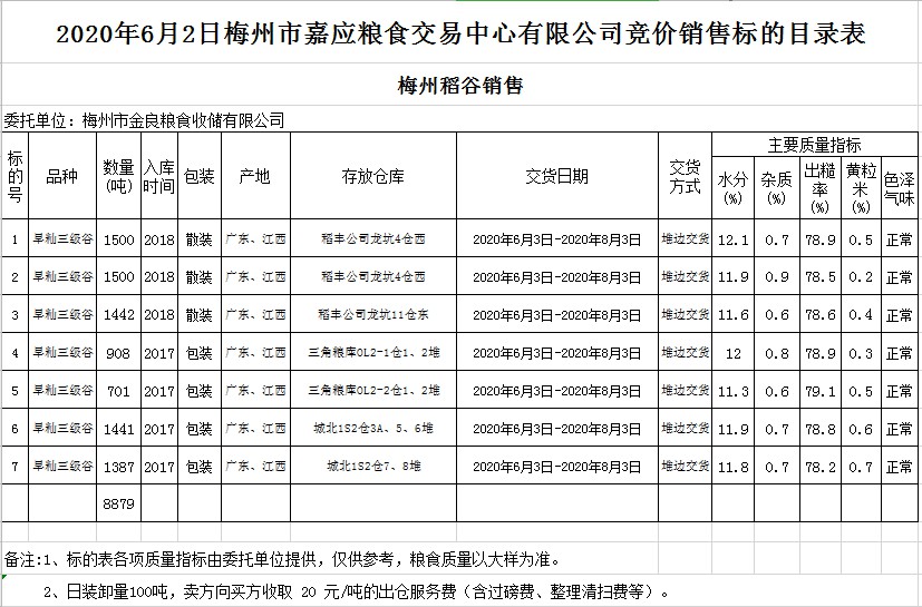 受客戶委托,梅州市嘉應(yīng)糧食交易中心有限公司定于2020年6月2日(星期二)舉辦糧食競(jìng)價(jià)交易會(huì),梅州市金良糧食收儲(chǔ)有限公司擬銷售2017年、2018年早秈稻8879噸。