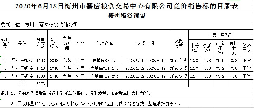 受客戶委托,梅州市嘉應(yīng)糧食交易中心有限公司定于2020年6月18日(星期四)舉辦糧食競(jìng)價(jià)交易會(huì),梅州市嘉泰糧食收儲(chǔ)公司擬銷售2018年早秈稻3778噸。