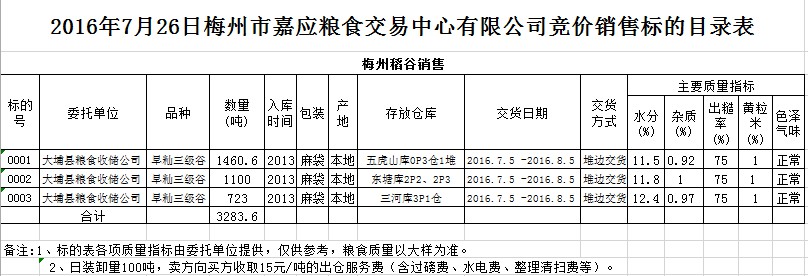 受客戶委托,梅州市嘉應(yīng)糧食交易中心有限公司定于2016年7月26日舉辦糧食競價(jià)交易會(huì),大埔縣糧食收儲(chǔ)公司擬銷售2013年早秈稻谷3283.6噸。