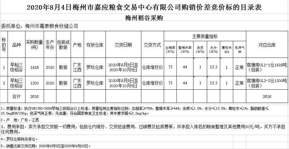 受客戶委托,梅州市嘉應糧食交易中心有限公司定于2020年8月4日(星期二)舉辦稻谷購銷價差聯(lián)動標的交易會,梅州市嘉泰糧食收儲公司擬銷售和采購早秈稻2616噸。