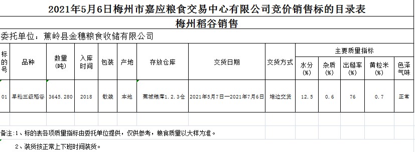 受客戶委托,梅州市嘉應(yīng)糧食交易中心有限公司定于2021年5月6日(星期四)舉辦糧食競價(jià)交易會(huì)。蕉嶺縣金穗糧食收儲(chǔ)有限公司擬銷售2018年早秈稻3645.28噸。