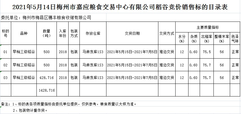 受客戶委托,梅州市嘉應(yīng)糧食交易中心有限公司定于2021年5月14日(星期五)舉辦糧食競價(jià)交易會。梅州市梅縣區(qū)穗豐糧食收儲有限公司擬銷售2018年早秈稻1428.716噸。