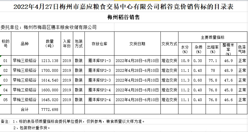 受客戶委托,梅州市嘉應(yīng)糧食交易中心有限公司定于2022年4月27日(星期三)舉辦糧食競價交易會。梅州市梅縣區(qū)穗豐糧食收儲有限公司擬銷售2019年早秈稻7772.698噸。