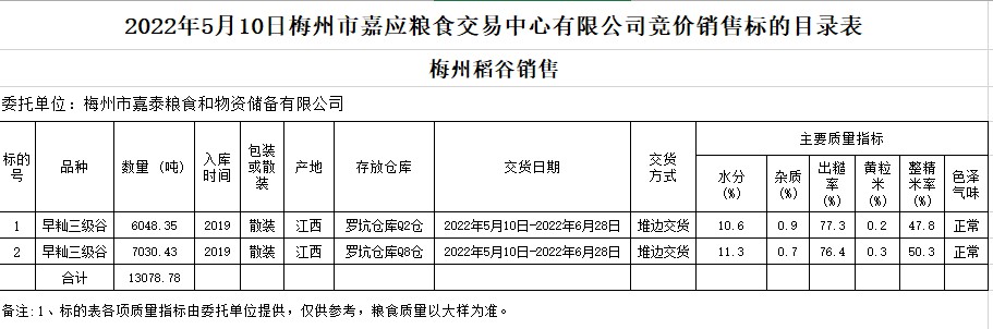 受客戶委托,梅州市嘉應糧食交易中心有限公司定于2022年5月10日(星期二)舉辦糧食競價交易會。梅州市嘉泰糧食和物資儲備有限公司擬銷售2019年早秈稻13078.78噸。