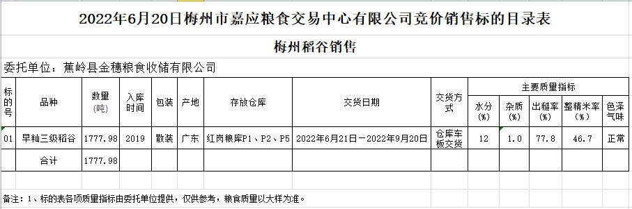 受客戶委托,梅州市嘉應糧食交易中心有限公司定于2022年6月20日(星期一)舉辦糧食競價交易會。蕉嶺縣金穗糧食收儲有限公司擬銷售2019年早秈稻1777.98噸。