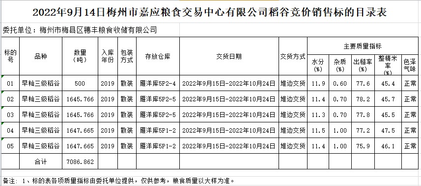 受客戶委托,梅州市嘉應(yīng)糧食交易中心有限公司定于2022年9月14日(星期三)舉辦糧食競價交易會。梅州市梅縣區(qū)穗豐糧食收儲有限公司擬銷售2019年早秈稻7086.862噸。