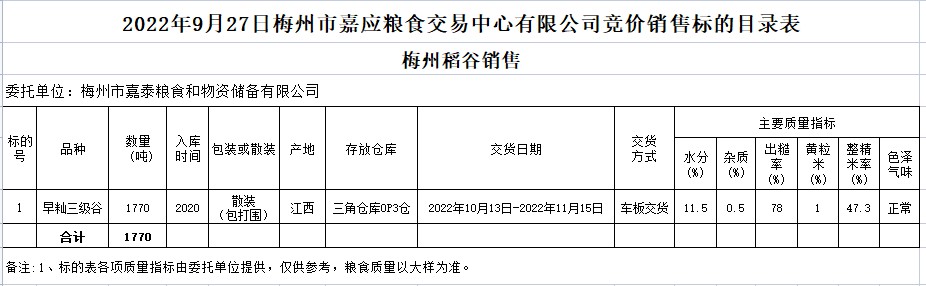 受客戶委托,梅州市嘉應(yīng)糧食交易中心有限公司定于2022年9月27日(星期二)舉辦糧食競價(jià)交易會。梅州市嘉泰糧食和物資儲備有限公司擬銷售2020年早秈稻1770噸。