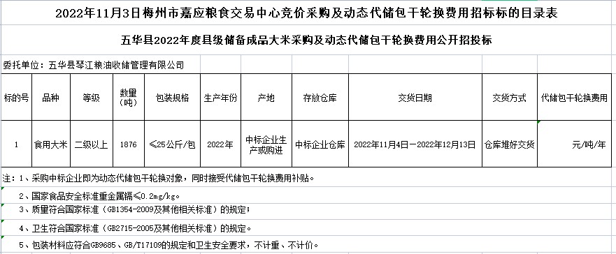 五華縣2022年縣級(jí)成品糧采購及動(dòng)態(tài)代儲(chǔ)包干輪換費(fèi)用公開招標(biāo)公告