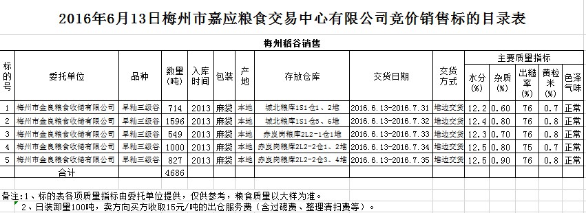 受客戶委托,梅州市嘉應(yīng)糧食交易中心有限公司定于2016年6月13日舉辦糧食競價交易會,梅州市金良糧食收儲有限公司擬銷售2013年早秈稻谷4686噸。