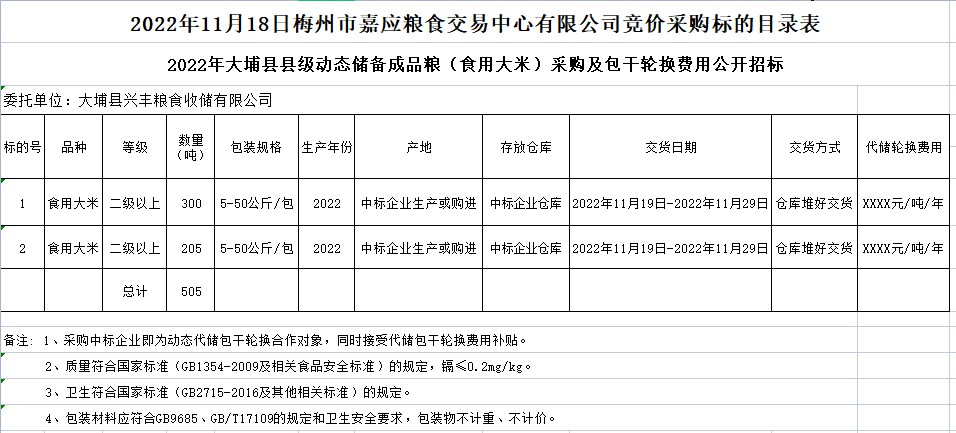 受客戶委托,梅州市嘉應(yīng)糧食交易中心有限公司定于2022年11月18日(星期五)上午10時10分在廣東省梅州市彬芳大道南161號梅州市糧食交易中心3樓,舉辦大埔縣縣級動態(tài)儲備成品糧(食用大米)采購公開招標。