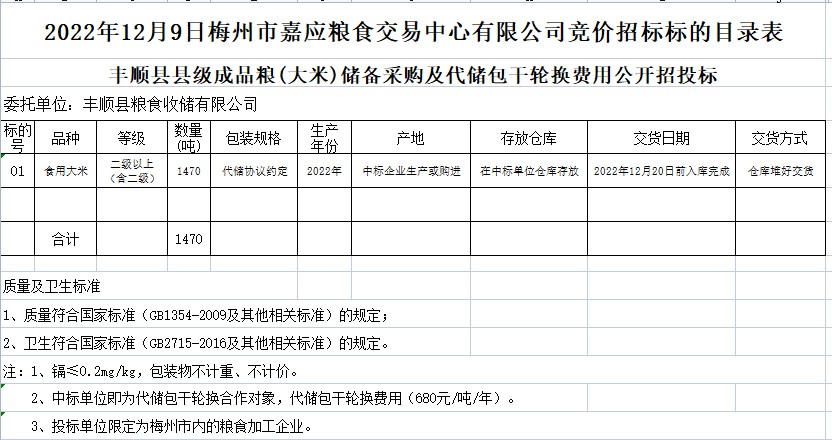 受客戶委托,梅州市嘉應(yīng)糧食交易中心有限公司定于2022年12月9日(星期五)上午10時(shí)在廣東省梅州市彬芳大道南161號(hào)梅州市糧食交易中心3樓,舉辦豐順縣縣級動(dòng)態(tài)儲(chǔ)備成品糧(食用大米)采購公開招標(biāo)。