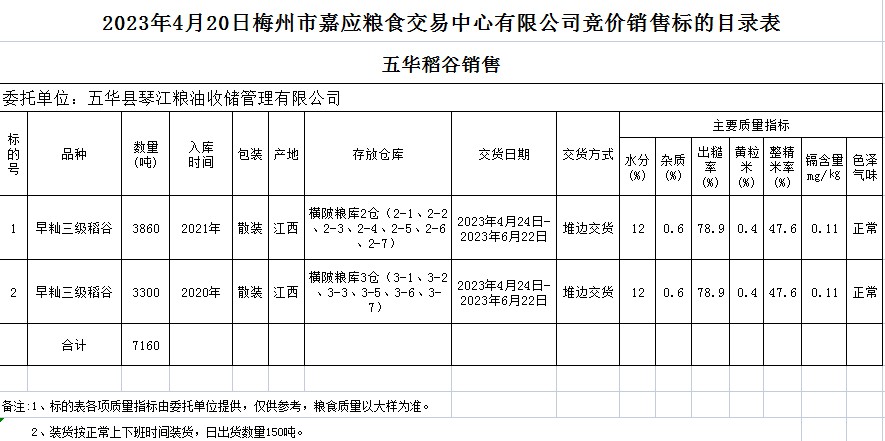 受客戶委托,梅州市嘉應(yīng)糧食交易中心有限公司定于2023年4月20日(星期四)舉辦糧食競價(jià)交易會(huì)。五華縣琴江糧油收儲管理有限公司擬銷售2020、2021年早秈稻7160噸。