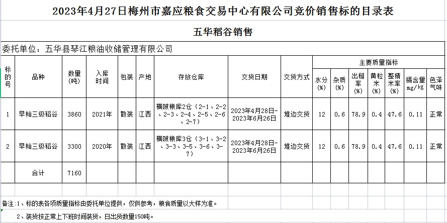 受客戶委托,梅州市嘉應(yīng)糧食交易中心有限公司定于2023年4月27日(星期四)舉辦糧食競(jìng)價(jià)交易會(huì)。五華縣琴江糧油收儲(chǔ)管理有限公司擬銷(xiāo)售2020、2021年早秈稻7160噸。