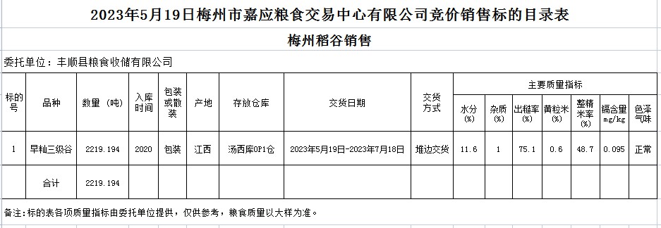 受客戶委托,梅州市嘉應(yīng)糧食交易中心有限公司定于2023年5月19日(星期五)舉辦糧食競價(jià)交易會(huì)。豐順縣糧食收儲(chǔ)有限公司擬銷售2020年早秈稻2219.194噸。