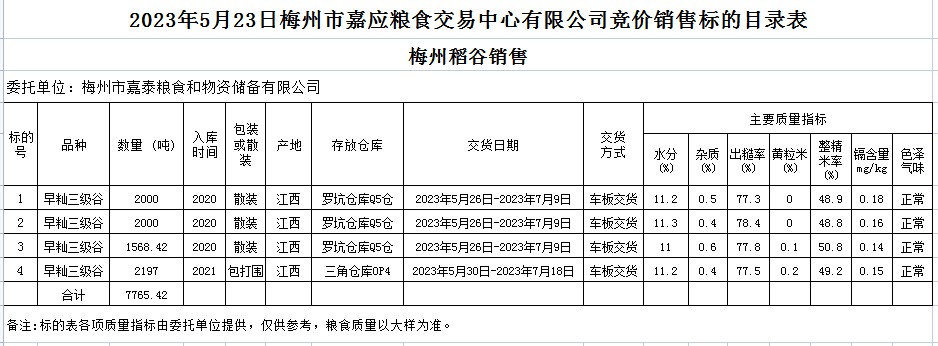受客戶委托,梅州市嘉應糧食交易中心有限公司定于2023年5月23日(星期二)舉辦糧食競價交易會。梅州市嘉泰糧食和物資儲備有限公司擬銷售2020年、2021年早秈稻7765.42噸。