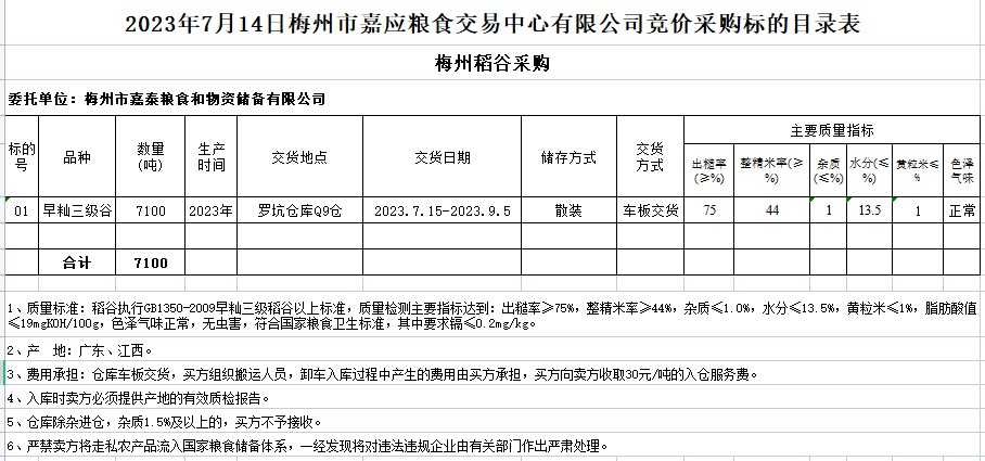 受客戶委托,梅州市嘉應(yīng)糧食交易中心有限公司定于2023年7月14日(星期五)舉辦糧食競價交易會。梅州市嘉泰糧食和物資儲備有限公司擬采購2023年早秈稻7100噸。