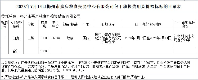二級小麥10000噸,總價款32577858.44元。包干輪換期限為3年,即從2023年7月15日至2026年7月14日。