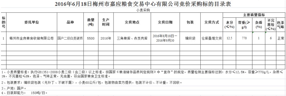 受客戶(hù)委托,梅州市嘉應(yīng)糧食交易中心有限公司定于2016年8月18日舉辦糧食競(jìng)價(jià)交易會(huì),梅州市金良糧食收儲(chǔ)有限公司擬采購(gòu)2016年產(chǎn)二級(jí)硬質(zhì)小麥5500噸。