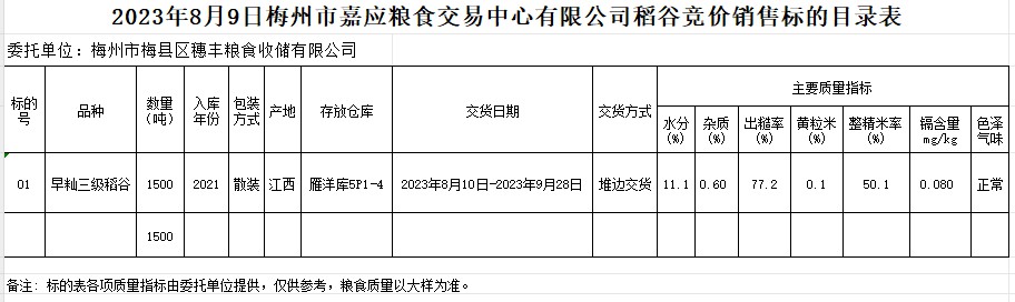 受客戶委托,梅州市嘉應(yīng)糧食交易中心有限公司定于2023年8月9日(星期三)舉辦糧食競價交易會。梅州市梅縣區(qū)穗豐糧食收儲有限公司擬銷售2021年早秈稻1500噸。