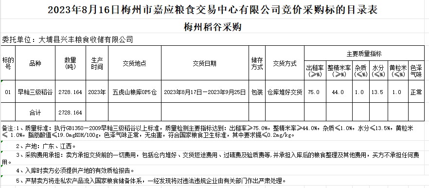 受客戶委托,梅州市嘉應(yīng)糧食交易中心有限公司定于2023年8月16日(星期三)舉辦糧食競價(jià)交易會。大埔縣興豐糧食收儲有限公司擬采購2023年早秈稻2728.164噸。