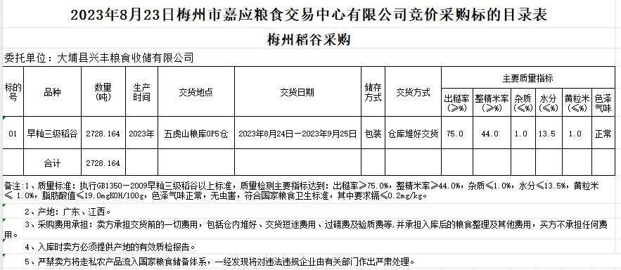 受客戶委托,梅州市嘉應(yīng)糧食交易中心有限公司定于2023年8月23日(星期三)舉辦糧食競(jìng)價(jià)交易會(huì)。大埔縣興豐糧食收儲(chǔ)有限公司擬采購2023年早秈稻2728.164噸。