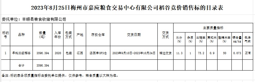 受客戶委托,梅州市嘉應糧食交易中心有限公司定于2023年8月25日(星期五)舉辦糧食競價交易會。豐順縣糧食收儲有限公司擬銷售2020年早秈稻3596.394噸。