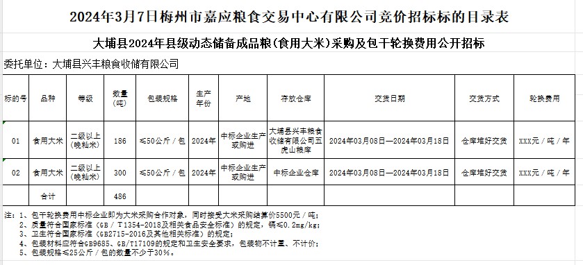受客戶委托,梅州市嘉應糧食交易中心有限公司定于2024年3月7日(星期四)上午10時20分在廣東省梅州市彬芳大道南161號梅州市糧食交易中心3樓,舉辦大埔縣2024年縣級動態(tài)儲備成品糧(食用大米)采購及包干輪換費用公開招標。