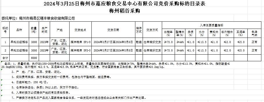受客戶委托,梅州市嘉應糧食交易中心有限公司定于2024年3月25日(星期一)舉辦糧食競價交易會。梅州市梅縣區(qū)穗豐糧食收儲有限公司擬采購2023年產(chǎn)早秈稻6000噸。