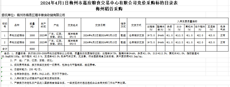 受客戶委托,梅州市嘉應(yīng)糧食交易中心有限公司定于2024年4月1日(星期一)舉辦糧食競價(jià)交易會(huì)。梅州市梅縣區(qū)穗豐糧食收儲(chǔ)有限公司擬采購2023年產(chǎn)早秈稻6000噸。