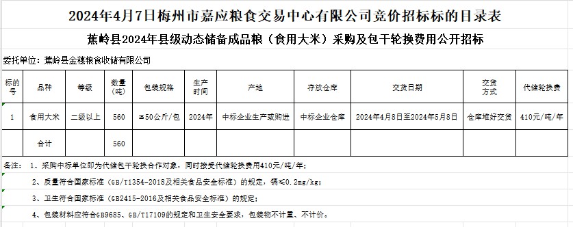 蕉嶺縣2024年縣級(jí)動(dòng)態(tài)儲(chǔ)備成品糧(食用大米)采購(gòu)及包干輪換費(fèi)用公開(kāi)招標(biāo)公告