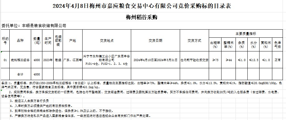 受客戶委托,梅州市嘉應(yīng)糧食交易中心有限公司定于2024年4月8日(星期一)舉辦糧食競價(jià)交易會(huì)。豐順縣糧食收儲(chǔ)有限公司擬采購2023年產(chǎn)晚秈稻4000噸。