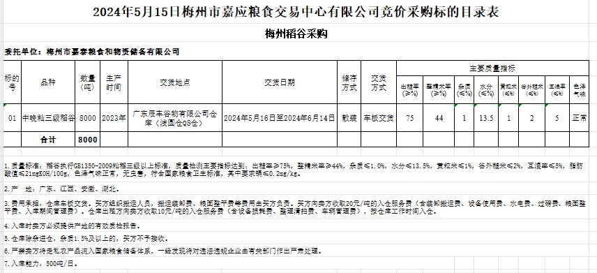 受客戶委托,梅州市嘉應(yīng)糧食交易中心有限公司定于2024年5月15日(星期三)舉辦糧食競(jìng)價(jià)交易會(huì)。梅州市嘉泰糧食和物資儲(chǔ)備有限公司擬采購(gòu)2023年產(chǎn)中晚秈稻谷8000噸。