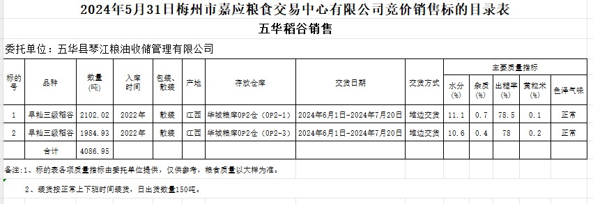 受客戶委托,梅州市嘉應糧食交易中心有限公司定于2024年5月31日(星期五)舉辦糧食競價交易會。五華縣琴江糧油收儲管理有限公司擬銷售2022年產(chǎn)早秈稻4086.95噸。