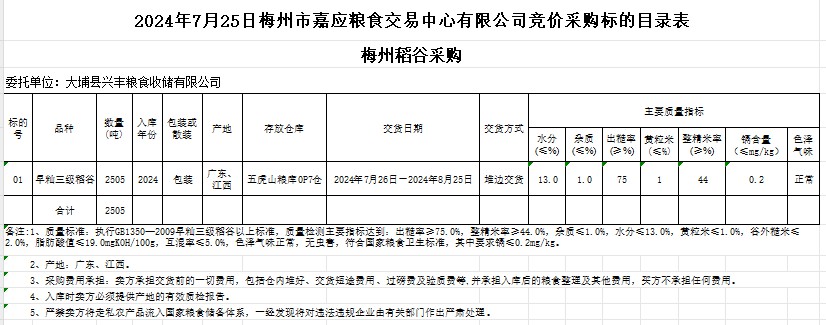 受客戶(hù)委托,梅州市嘉應(yīng)糧食交易中心有限公司定于2024年7月25日(星期四)舉辦糧食競(jìng)價(jià)交易會(huì)。大埔縣興豐糧食收儲(chǔ)有限公司擬采購(gòu)2024年產(chǎn)早秈稻谷2505噸。