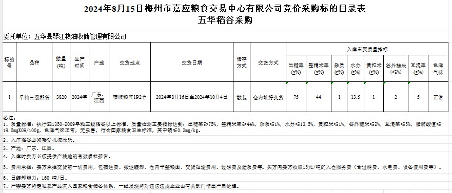 受客戶委托,梅州市嘉應糧食交易中心有限公司定于2024年8月15日(星期四)舉辦糧食競價交易會。五華縣琴江糧油收儲管理有限公司擬采購2024年產(chǎn)早秈稻谷3820噸。