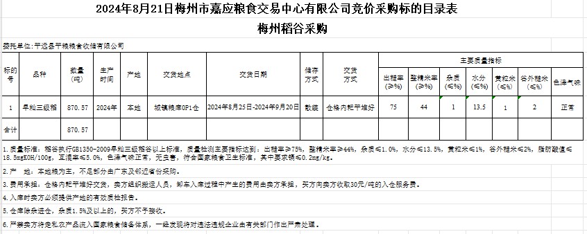 受客戶委托,梅州市嘉應(yīng)糧食交易中心有限公司定于2024年8月21日(星期三)舉辦糧食競價交易會。平遠(yuǎn)縣平糧糧食收儲有限公司擬采購2024年產(chǎn)早秈稻870.57噸。