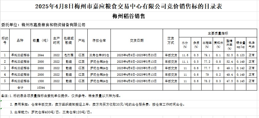 受客戶委托,梅州市嘉應(yīng)糧食交易中心有限公司定于2025年4月8日(星期二)舉辦糧食競價(jià)交易會(huì)。梅州市嘉泰糧食和物資儲(chǔ)備有限公司擬銷售2022年產(chǎn)早秈稻谷10344噸。